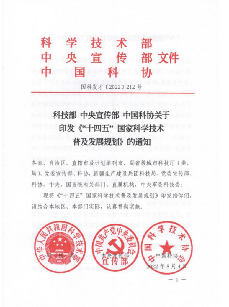 印发《“十四五”国家科学技术普及发展规划》
