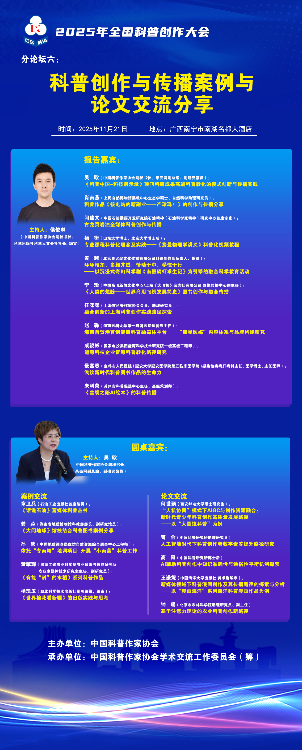 为深入贯彻落实习近平总书记关于科技创新、科学普及和科学素质建设的重要论述,贯彻落实党的二十届四中全会精神和《中华人民共和国科学技术普及法》,促进高质量科普作品创作,提升科普原创能力,实现科普创作繁荣发展,助力创新文化培育,中国科普作家协会定于2025年11月20-22日在广西壮族自治区南宁市召开2025年全国科普创作大会。