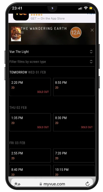 随着电影的放映,其播放场次、上映影院数量以及上映城市数量也不断减少。这种自然衰减的现象自是必然,毕竟大部分观众已经在之前的几周观看了影片,而且选择二刷或者三刷电影的人也不占多数。但是,减速期是否可以来得晚一些呢?譬如,先于《流浪地球2》上映的《阿凡达2:水之道》在2023年3月6日星期一开始的新一周内,仍能保持在Vue the Light一天内有1至3场排片,且3月6日晚网站显示利兹市每场有0至10张票预售出,与此同时,《流浪地球2》已在该影院下映。