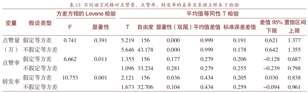 表11列出了“无穷小亮的科普日常"账号视频的语言风格基本情况,在158个样本视频中,语言风格为“朴实自然"和“严肃认真"的视频数分别为21和7,均小于30,不满足单因素方差分析时所要求的最低样本量。故在使用SPSS26.0进行数据分析时,将这两类风格合并为“朴实认真"类别,组别合并处理后再进行独立样本T检验。其中,点赞量、点赞率、转发率均为正态得分法转换后的数据。输出结果如表12和表13。