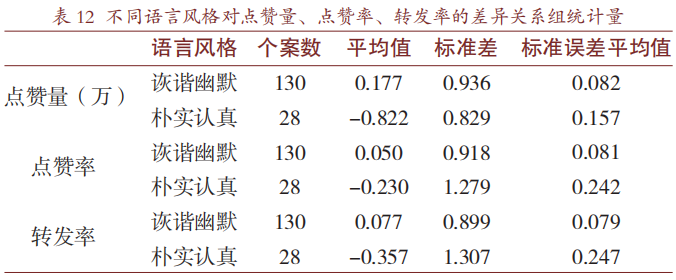 由表格数据可知,就点赞量而言,诙谐幽默的语言风格视频要显著优于朴实认真风格的视频(0.177>-0.822,P=0.000<0.05);诙谐幽默的视频点赞率高于朴实认真的视频,但不同语言风格的视频点赞率没有显著差异(0.050>-0.230,P=0.141>0.05);语言诙谐幽默的视频转发率并不显著优于朴实认真风格的视频(0.077>-0.357,P=0.052>0.05)。