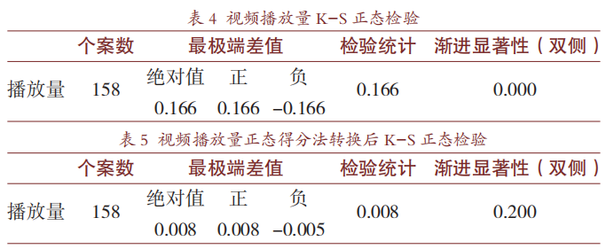 从传播学中的传播效果论来看,“一次传播"主要取决于标题的好坏,“二次传播"则主要依赖内容的好坏。视频的播放量是反映B站UP主受欢迎程度的重要指标。对158个视频的播放量进行初步观察分析,可以发现不同视频的播放量差异较大,播放量达到十万级的有47个,百万级的有110个,千万级的只有1个,对比全网热门视频的播放量数据,张辰亮的视频总体受欢迎程度是较高的。基于已有数据,笔者对标题类型与播放量的大小是否具有显著关系进行了探究,在SPSS26.0软件中对播放量进行K-S正态检验,输出结果如表4,可知播放量不满足正态分布(P=0.000<0.05),笔者在SPSS26.0软件中对播放量进行正态得分法转换,再重复前述K-S正态性检验步骤,得到检验数据如表5所示,即转换后的视频播放量通过了正态性检验(P=0.10>0.05)。
