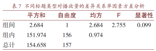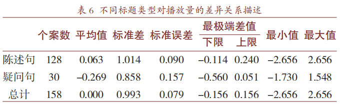 为验证不同的视频标题类型与播放量的差异关系,对视频数据进行了单因素方差分析,输出结果如表6和表7所示。相较于疑问句标题的视频,陈述句标题的视频受欢迎程度更高,但不同标题类型的视频在播放量上没有显著性差异(0.063>>-0.269,F=2.755,P=0.099>0.05)。UP主张辰亮的视频标题句式主要是陈述句,其次是疑问句。作为科普区的博主,他分享的是准确规范的科学知识,虽然不要求保证完全的学术气息,但是也不可“自甘堕落",为博流量而取一些极具噱头的标题。其对疑问句的使用也恰如其分,适当地运用疑问句标题,不仅能够激发观众兴趣,而且能增添短视频标题的表现力和感染力,起到画龙点睛的作用[15]。
