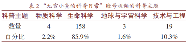 2017年2月,教育部印发《义务教育小学科学课程标准》,小学科学课程的内容被划分成四大领域,即物质科学、生命科学、地球与宇宙科学、技术与工程[13]。此外,在2022年版的《义务教育科学课程标准》中,以布鲁纳(J.S.Bruner)的结构主义教学理论为基础提出的13个“学科核心概念"同样暗合了前述四大领域[14]。通过科普短视频传播科学技术知识的过程本质上可以理解为教育过程,以上课程内容的领域划分囊括了各短视频平台已有的科普主题,故本研究将按照这四大领域对UP主张辰亮的视频内容进情况见表2。