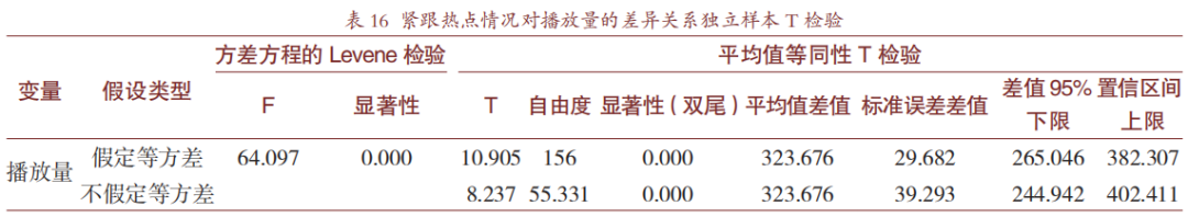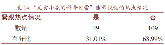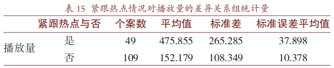 如今的互联网环境,良好的“网感"能够帮助科普视频创作者打造出热门、爆款风格的视频。表14呈现的是UP主张辰亮的视频跟随网络热点的情况。在SPSS26.0中对是否紧跟热点与视频播放量进行独立样本T检验,数据结果如表15和表16。分析数据可知,紧跟网络时事热点的视频,其播放量要显著高于没有紧跟热点的视频(475.855>152.179,P=0.000<0.05)。