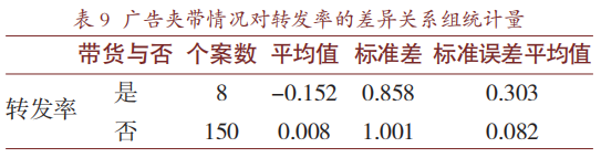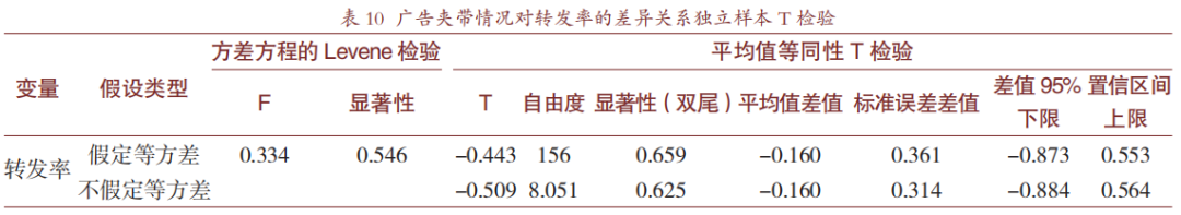通过对转发量进行初步分析,发现不同视频的转发量差异较大,为保证数据分析的客观性,此处,笔者引入“转发率"(转发量与播放量的比值)作为辅助分析变量。对转发量和转发率分别进行K-S正态性检验,发现两者均不满足正态性分布(P=0.000<0.05)。对转发率进行正态得分法转换,使其通过正态性检验。为验证广告夹带情况对转发率的差异关系,对视频数据进行独立样本T检验,得到结果如表9和表10。分析数据可知,夹带广告的短视频的转发率要低于不夹带广告的视频,这一点符合我们一贯的认知,但夹带广告与否对短视频的转发率高低没有显著差异(0.008>-0.152,P=0.330>0.05)。