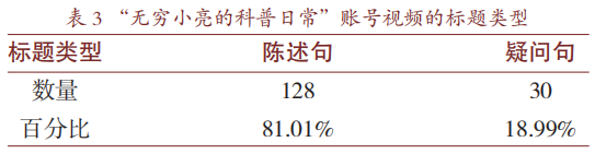 新媒体环境下,短视频信息泛滥,公众无暇细看各种短视频,因此短视频浏览进入了一个“读题"时代。一个好的标题需要同时满足两个关键要素:与内容相符和吸引人点击。短视频博主编造标题来吸引公众眼球,哗众取宠,这便是我们常说的“标题党",首先就是疑问句的乱用,这种“标题党"现象对于媒体行业的长远发展产生了恶劣影响[15];可标题若是过于晦涩无趣,受众又会缺乏点开视频的欲望。表3是该账号视频的标题类型划分情况。