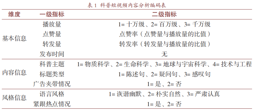 通常,我们对科普视频“术"的理解侧重于工具性与实用性,对“道"的理解偏向精神性与抽象性。“术"包括画质、声音、场景、灯光、服化道、剪辑、音乐音效、演技等;“道"指的是对科学的理解深度。已有的科普短视频研究多从定性角度出发,集中于科普短视频的取材分布领域、资料来源、叙事要素、内容延伸、传播策略与传播效果等方面[7-10],少有学者从实证角度分析影响科普短视频传播效果的因素。鉴于已有研究中实证部分的讨论仍有完善空间,在本研究中,笔者借鉴前人内容分析框架并加以增删[11],将“术"的分析划分为三个维度,即基本信息、内容信息、风格信息。基本信息包含播放量(十万级、百万级、千万级)、点赞量、转发量、发布时间;内容信息包含科普主题(物质科学、生命科学、地球与宇宙科学、技术与工程)、标题类型(陈述句、疑问句、感叹句)、广告夹带情况(是、否);风格信息包含语言风格(诙谐幽默、朴实自然、严肃认真)、紧跟热点情况(是、否)。根据《全民科学素质行动规划纲要(2021—2035年)》中对国民科学素质的界定,“公民具备科学素质是指崇尚科学精神,树立科学思想,掌握基本科学方法,了解必要科技知识,并具有应用其分析判断事物和解决实际问题的能力"[12],笔者将“道"视作科学精神、使命担当、内涵修养和育人情怀。采用内容分析法,对“无穷小亮的科普日常"2019年12月26日至2021年12月7日发布的184个视频归类梳理,建立“科普短视频内容分析编码表"(见表1)。最后使用Excel和SPSS26.0软件对编码内容展开分析,提炼出优秀的生命科学类科普短视频所应包含的要素。