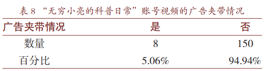 当短视频博主积累一定量的粉丝数时,巨大的流量便会引来广告商的青睐。根据前述的“二次传播"理论,一般来说,只有当视频的受众充分认可视频的内容时,才会对视频进行转发,转发量能够很好地反映用户对短视频的认可程度。表8呈现了158个生命科学类科普短视频的广告夹带情况。在158个短视频中,夹带广告的短视频仅占5.06%。科普短视频博主在自己的内容中夹带广告并非完全不可,但不可本末倒置,将科普视频当作盈利的工具。