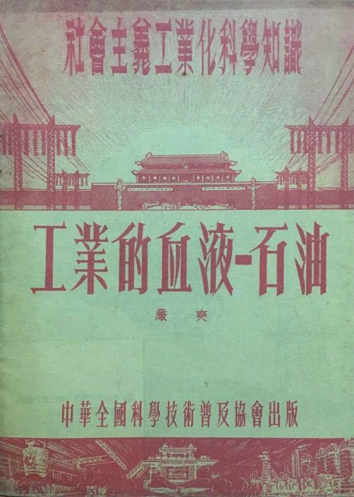 中华人民共和国成立之初,尽管国内石油工业落后,但人民沉浸在建设祖国的激情中,石油科普出版呈现出爆发态势。20世纪50到60年代的石油科普图书格外重视普及性,一批隶属于各类百科丛书、技术丛书的石油科普图书相继出版。罗村所著的《石油》(三联书店1950年版)为"新中国百科小丛书"分册之一,许默夫编的《石油是怎样合成的》(新华书店1950年版)属于"科学技术丛书"分册之一,黎象武编著的《石油》(商务印书馆1953年版)是"科学小文库丛书"分册之一,张焱所著的《石油的故事》(通俗读物出版社1955年版)是"工业常识小丛书"分册之一。1957年石油工业出版社出版的"石油工业基本知识丛书",包括向阳编著的《祖国的石油资源》和金伟光所著的《怎样找石油》等分册。值得一提的是,1954年,中华全国科学技术普及协会根据石油工程专家严爽的讲座速记稿出版了《工业的血液—石油》(图9)一书,这是一本当时少见的从工程专家角度介绍石油的作品,对提升最广泛劳动大众的科学素质大有裨益。