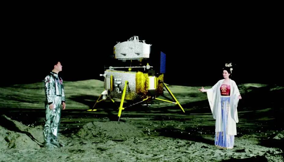 图3《Go"兔"月球》中的空天兔形象 图4《遇见嫦娥》中记者与"AI嫦娥"同台