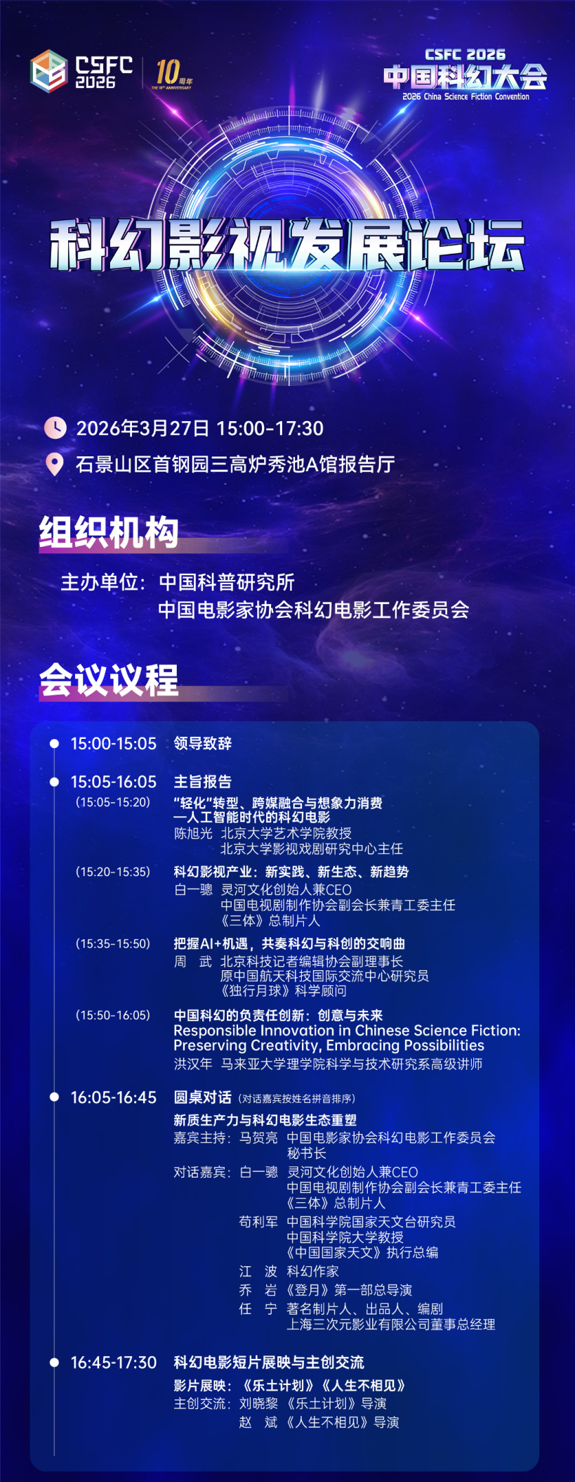 简介:本论坛聚焦科幻影视与科学的融合发展,旨在搭建科学与影视界的对话桥梁,深入探讨科幻电影在科学传播与科技创新中的赋能作用。活动将组织知名专家、影视创作者开展主题报告与圆桌对话,分享“科影融合”的实践经验,并发布第八届蓝星球科幻电影周主竞赛单元征集活动及 2026“新物种”野外科考与 AIGC 想象力研修营计划,汇聚多方智慧,共同推动科幻影视高质量发展,构建协同创新的交流平台。